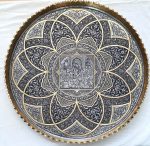 سینی برنجی قلمزنی شده ، قطر ۶۰ سانت توضیح: سینی لب کنگره برنجی که بصورت دستساز ساخته شده و بر روی ان نقوش مختلف از جمله بزم ، گل ومرغ، اسلیمی و… قلمزنی شده است