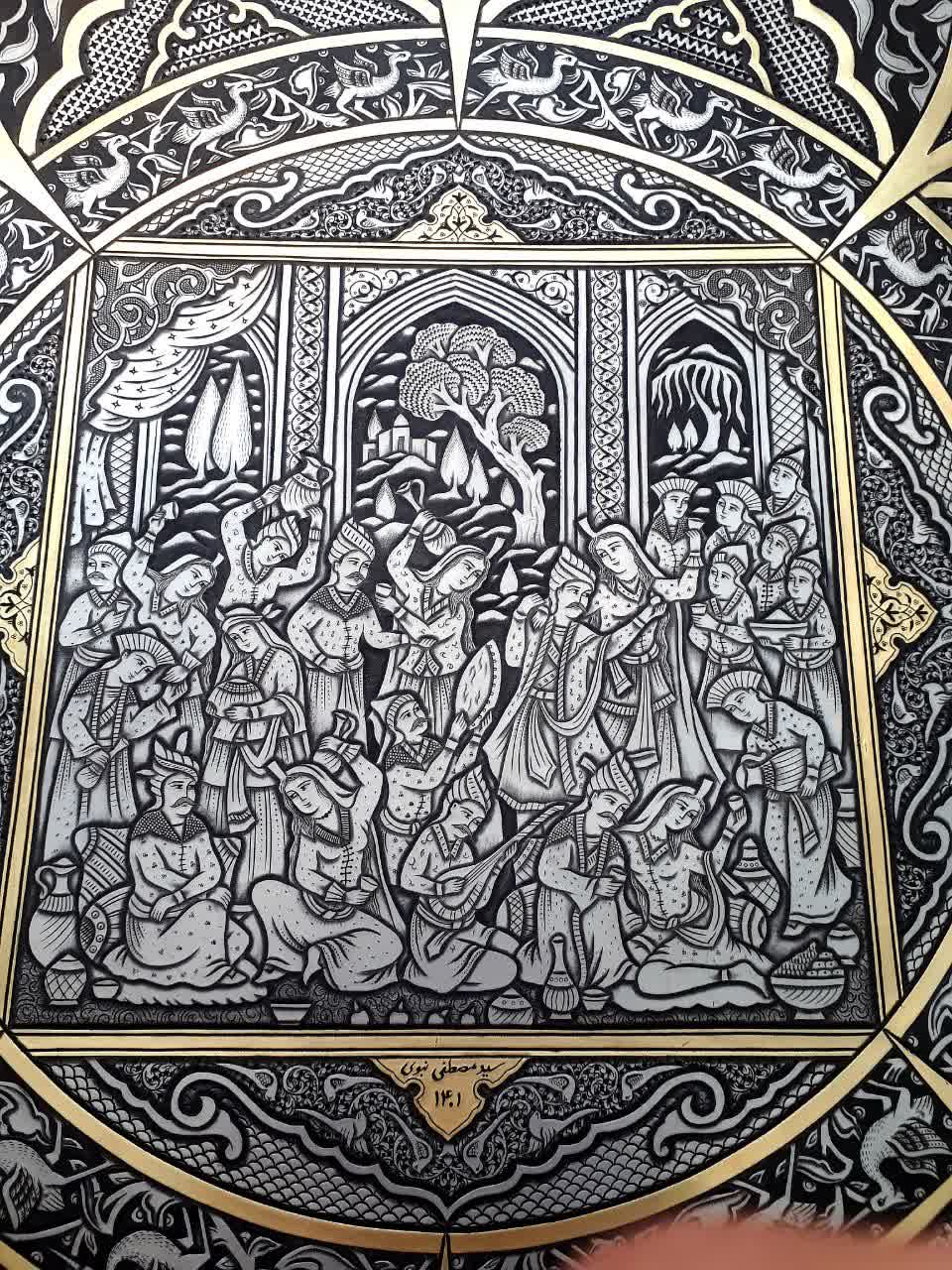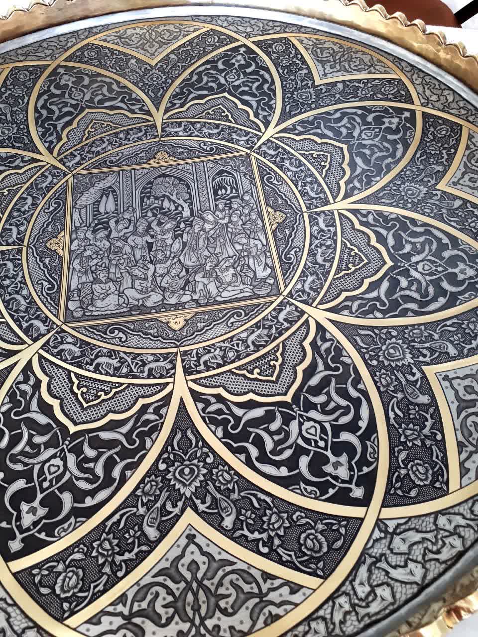 سینی برنجی قلمزنی شده ، قطر ۶۰ سانت توضیح: سینی لب کنگره برنجی که بصورت دستساز ساخته شده و بر روی ان نقوش مختلف از جمله بزم ، گل ومرغ، اسلیمی و… قلمزنی شده است
